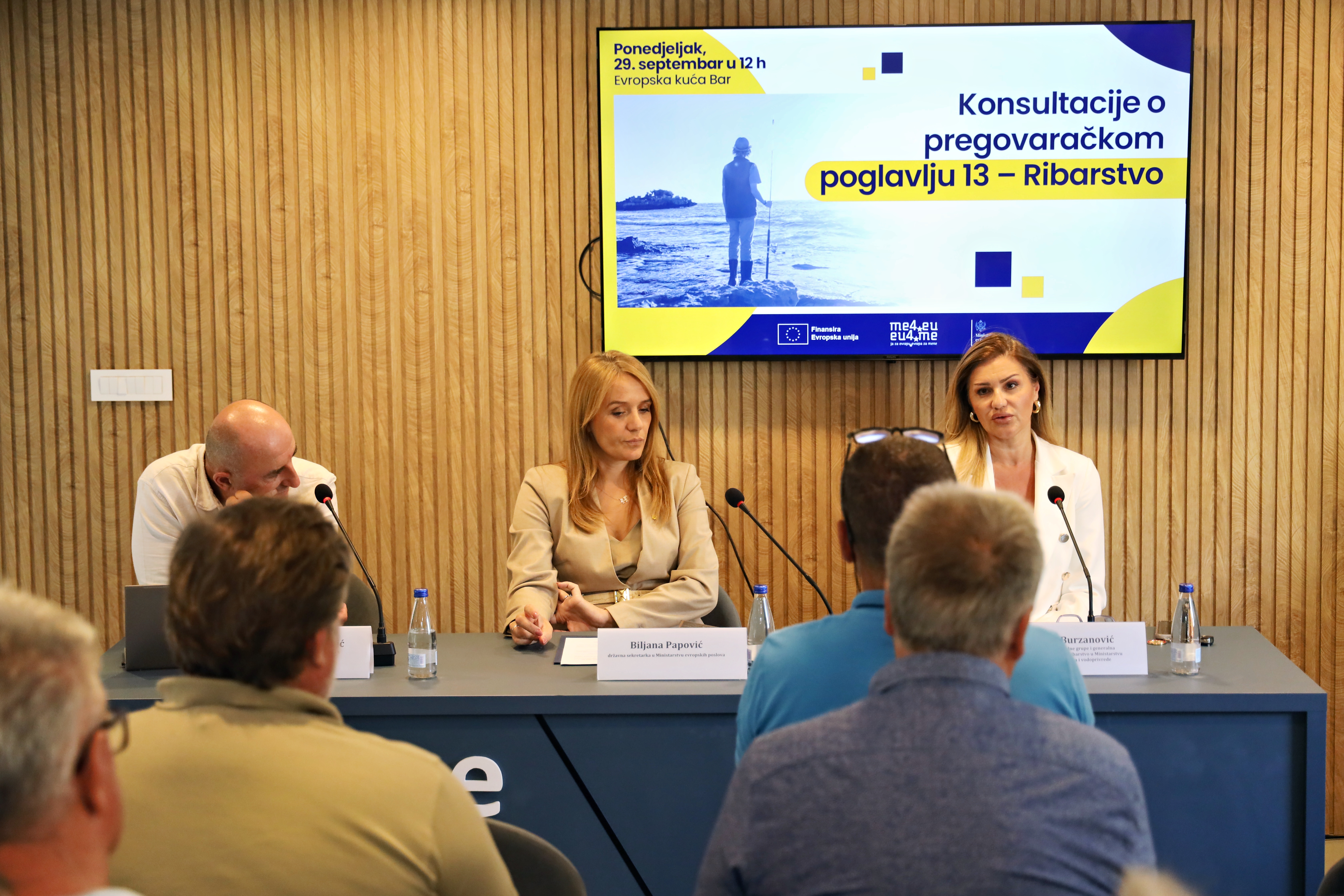 Sa predstavnicima nekoliko udruženja ribara razgovarali su državna sekretarka u Ministarstvu evropskih poslova Biljana Papović, šefica Pregovaračke radne grupe i generalna direktorica Direktorata za ribarstvo u Ministarstvu poljoprivrede, šumarstva i vodoprivrede Katarina Burzanović i naučni savjetnik u Institutu za biologiju mora i član Pregovaračke radne grupe za poglavlje 13, Aleksandar Joksimović.
