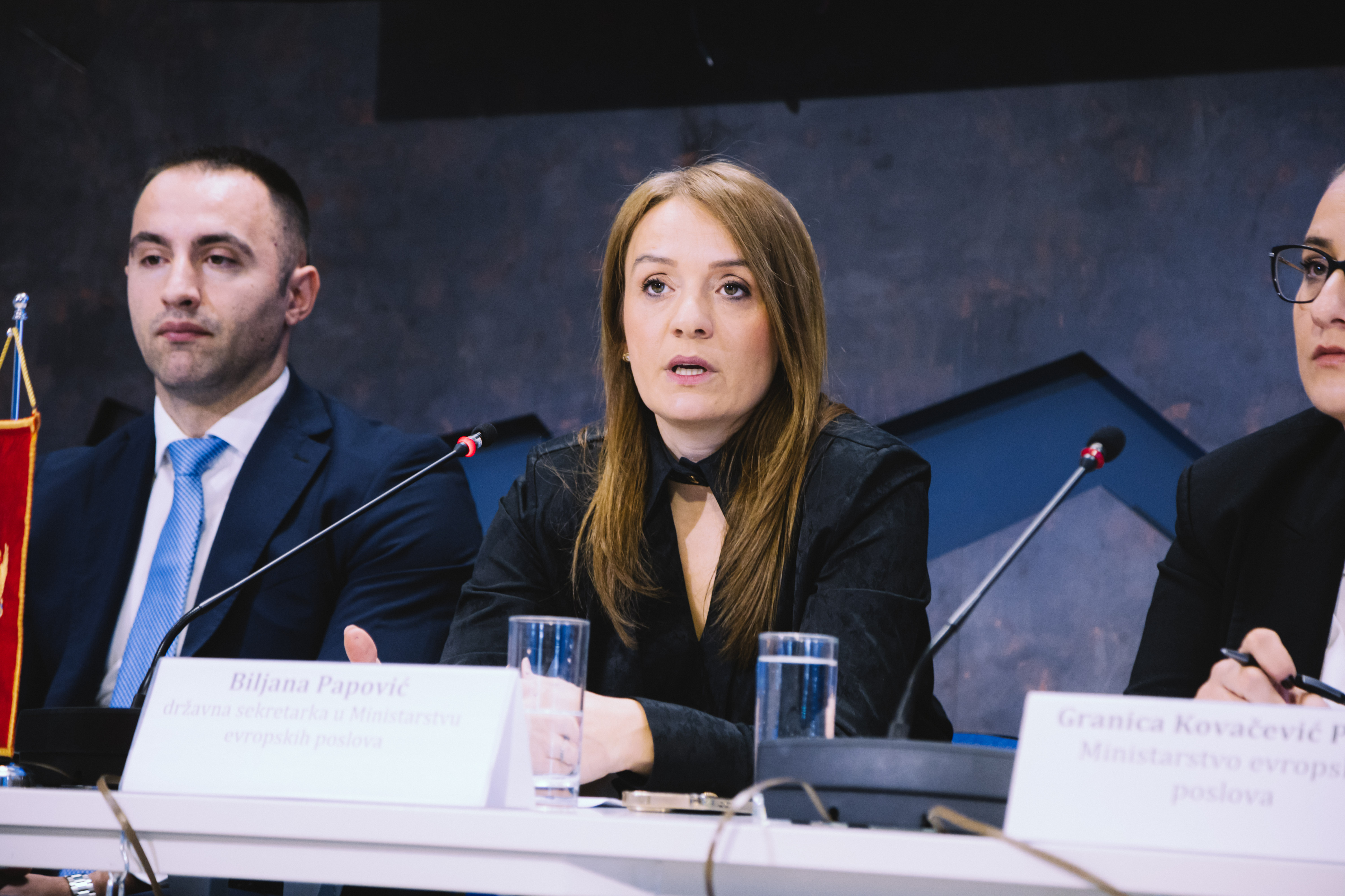 Državna sekretarka Papović pojasnila je da Program pristupanja predstavlja najvažniji strateški dokument u pregovaračkom procesu i da obuhvata obaveze za 2026. i 2027. godinu. U nastavku je ukazala da je pred Crnom Gorom, shodno dosadašnjoj praksi, veliki broj obaveza u okviru samog dokumenta, ali da je neophodno napraviti jasnu razliku između onih koje proizilaze iz završnih mjerila, odnosno zatvaranja pregovaračkih poglavlja. Istakla je da su upravo te obaveze prioritet Vlade i pregovaračke strukture u prva dva kvartala 2026. godine, kada je predviđen rok za njihovu realizaciju, a sve u cilju zatvaranja svih pregovaračkih poglavlja do kraja 2026. godine.